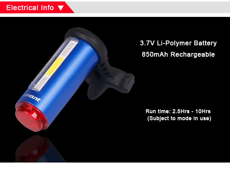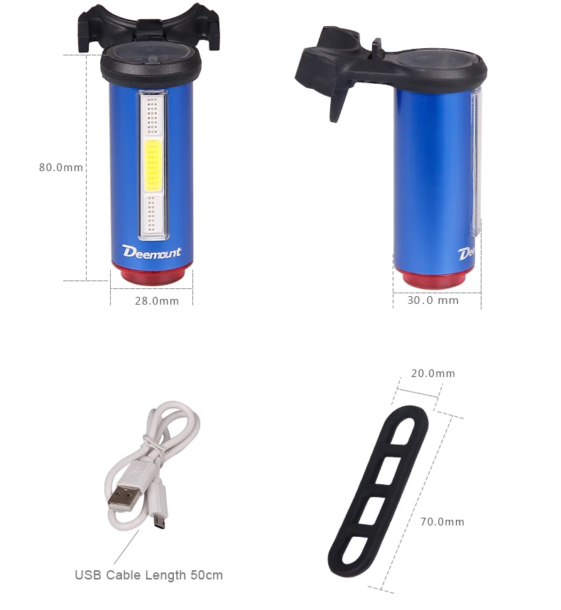 Specifications: - Light source: COB LED; Light Color: Red White or Red Blue; - Beam Angle: 150 degree visible; - Light control: Press button; - Battery: Li-polymer, 3.7V 250mAH; - Run time: 8 to 20 hours, subject to mode in use; - Charging: USB charge (Android type port), 5V 0.5A; - Ingress protection: IPX5, Water Splash Proof; do not submerge in water to use; - Net weight: About 20 grams - Mount: Fits tube Dia. 2.0-4.0CM | 1. Wide visual range. 2. Easy to install. 3. Use the built-in500mAh rechargeable battery 4. lift time: 4-5 hours 5. Surface waterproof effect reaches IPX2 6. High quality LED, 7. Warning LED: red and blue flashing | Deemount Bicycle Tail Light