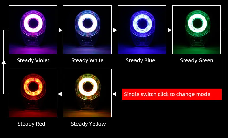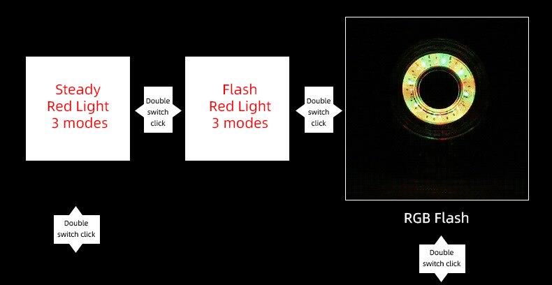 · Switch: Press button; long press to turn on or off, short press to change among the first three modes; double quick press to change for the next three modes