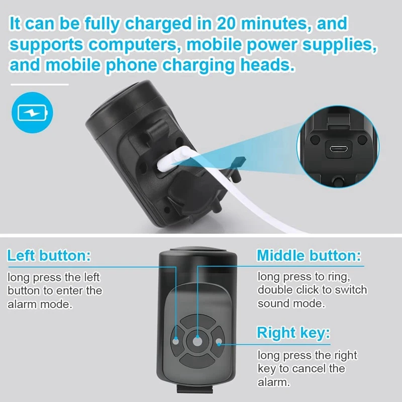 [USB Rechargeable]: The bike horn for adults built-in USB rechargeable battery, easy to use. Fully charged in 20 minutes, this electric bike horn can be used for 30-40 days, ring 3000-4000 times, and stand by for 180 days.