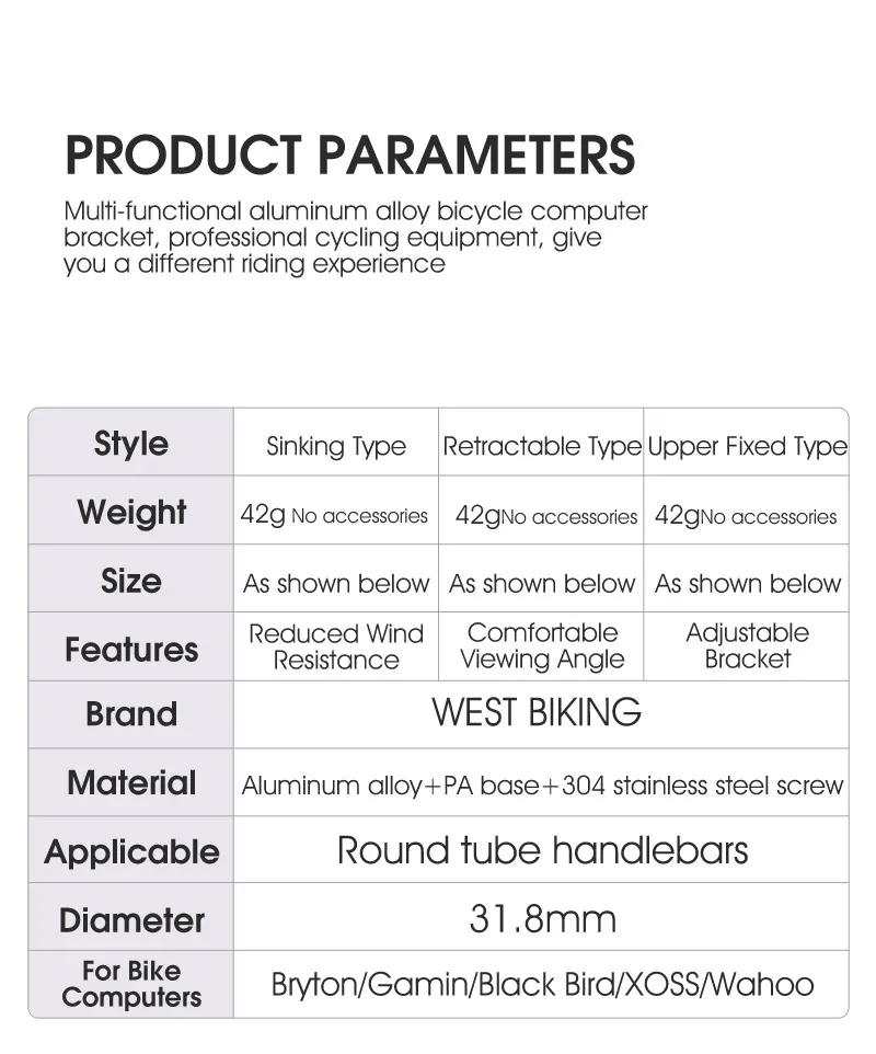 ✨TAKE A LOOK!:WEST BIKING Bicycle Computer Stand Extension Lamp Camera Holder Bike Light Bracket Mount For Bryton Gamin Black Bird XOSS Wahoo PRODUCT PROPERTY:✨ 1: West biking offer amazing our product.Our product is from cn(origin). REASONS TO BUY:Provides a Clear View: The design of this bicycle computer stand extension lamp camera holder ensures that it provides a clear view of your device, even in low-light conditions. xoss g bicycle computer holder: This bike computer mount is designed to fit the XOSS G bicycle computer perfectly, providing a secure and stable way to attach it to your bike. The holder is made of high-quality materials, ensuring that your computer stays safe and secure while you ride. bike computer mount bryton: This bike computer mount is designed to fit the Bryton bike computer perfectly, providing a secure and stable way to attach it to your bike. The holder is made of high-quality materials, ensuring that your computer stays safe and secure while you ride. bicycle computer holder bryton: This bike computer holder is designed to fit the Bryton bike computer perfectly, providing a secure and stable way to attach it to your bike. The holder is made of high-quality materials, ensuring that your computer stays safe and secure while you ride. biking bicycle computer stand: This bike computer stand is designed to provide a secure and stable way to attach your bike computer to your bike, while also keeping it easily visible and accessible. The stand is made of high-quality materials, ensuring that your computer stays safe and secure while you ride. RELATED INFO:✨ Bicycle computer holder bryton: this bike computer holder is great for keeping your computer on the stand. also, it could be used as a camera holder to hold your phone in place. ✨ Bike computer mount bryton: this bike computer mount is made of high quality aluminum alloy. it's very sturdy and durable, not easy to deform or break.